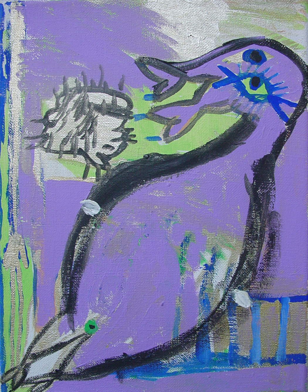Как противопоставление темным снам – холсты предыдущего «невеселого»: “Hello teenage America”, “Ups\Downs”, “Fly little bird to Hiroshima \ Feel magic word of Hiroshima”, etc., - противопоставление по яркости брызг, а смыслом вплетающиеся в спонтанность снов спящих. И холст - на голубом фоне девочка спиной, убегает, уходит, - является неким связующим звеном этих двух периодов: «яркого и страшного» и «черного в ожидании». Получается краткая ретроспектива, по форме – с отпечатком таких качественных хоррорс, даже если речь – о маленькой птичке.